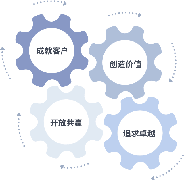 成就客户是一切决策的出发点,,创造价值是衡量所有工作的标准,,,,追求卓越是我们做事做人的态度,,,开放共赢是我们的格局也是最终的结果。。。。价值观的齿轮环环相扣,,,,推动着组织里的每个人不断向前。。